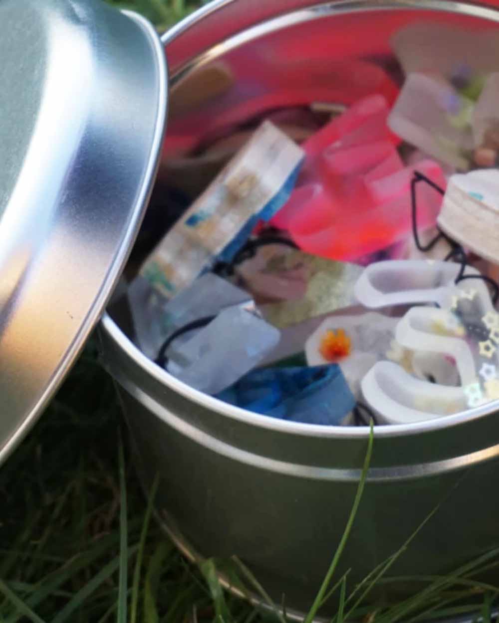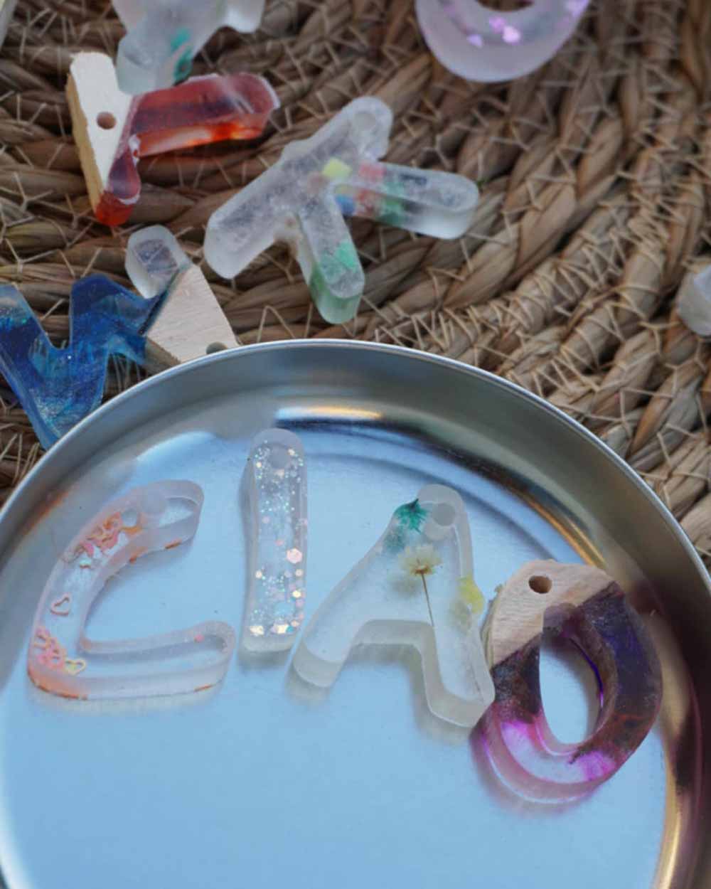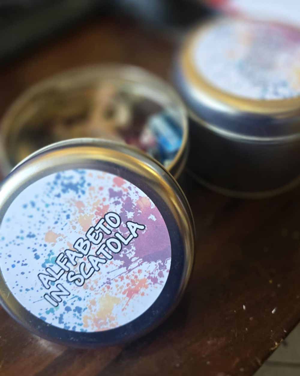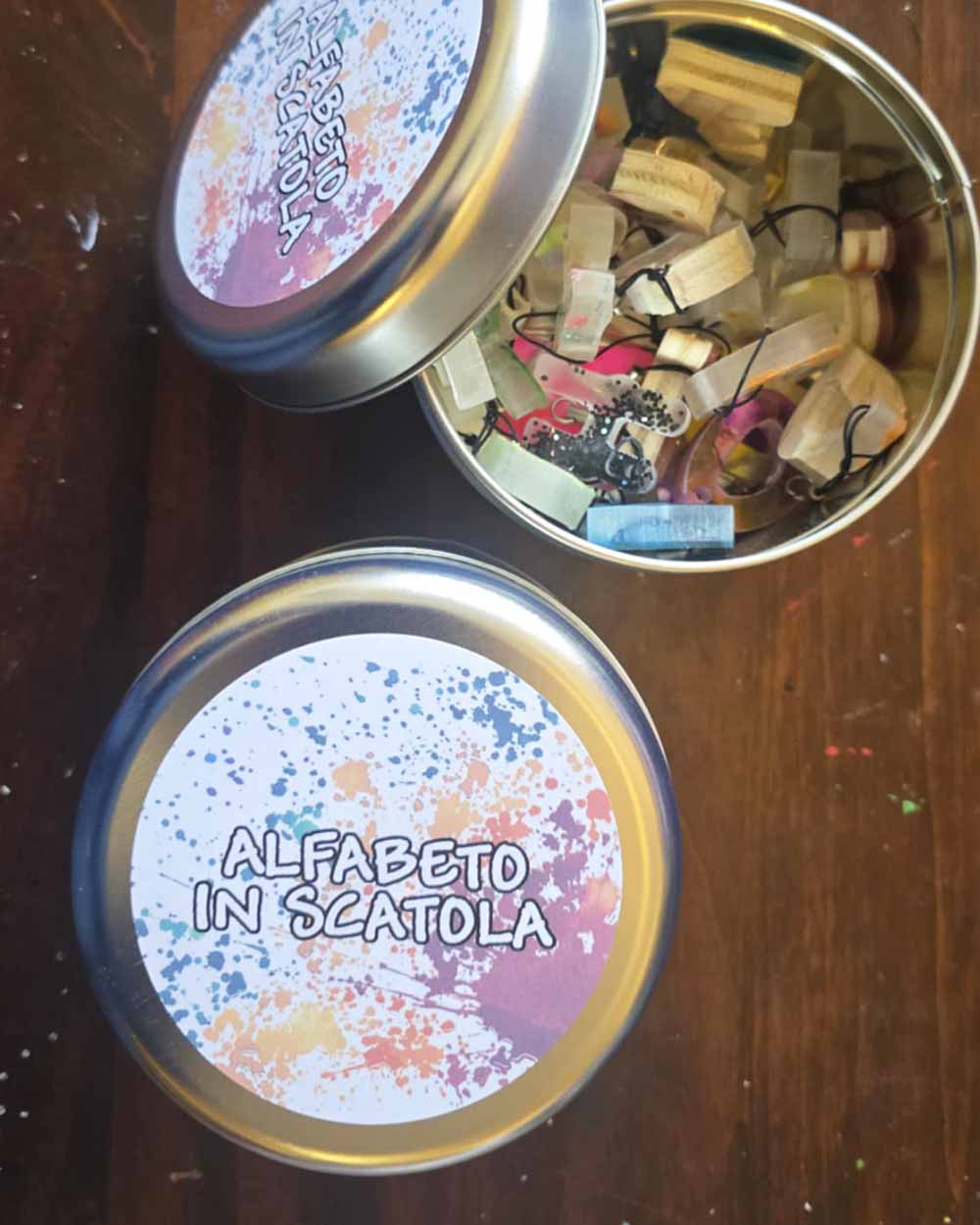 Tutte le letterine dell'alfabeto (circa 3/4cm l'una) in resina colorata e legno, raccolte in una scatola di latta (11x8cm) per riporle e ritrovarle.